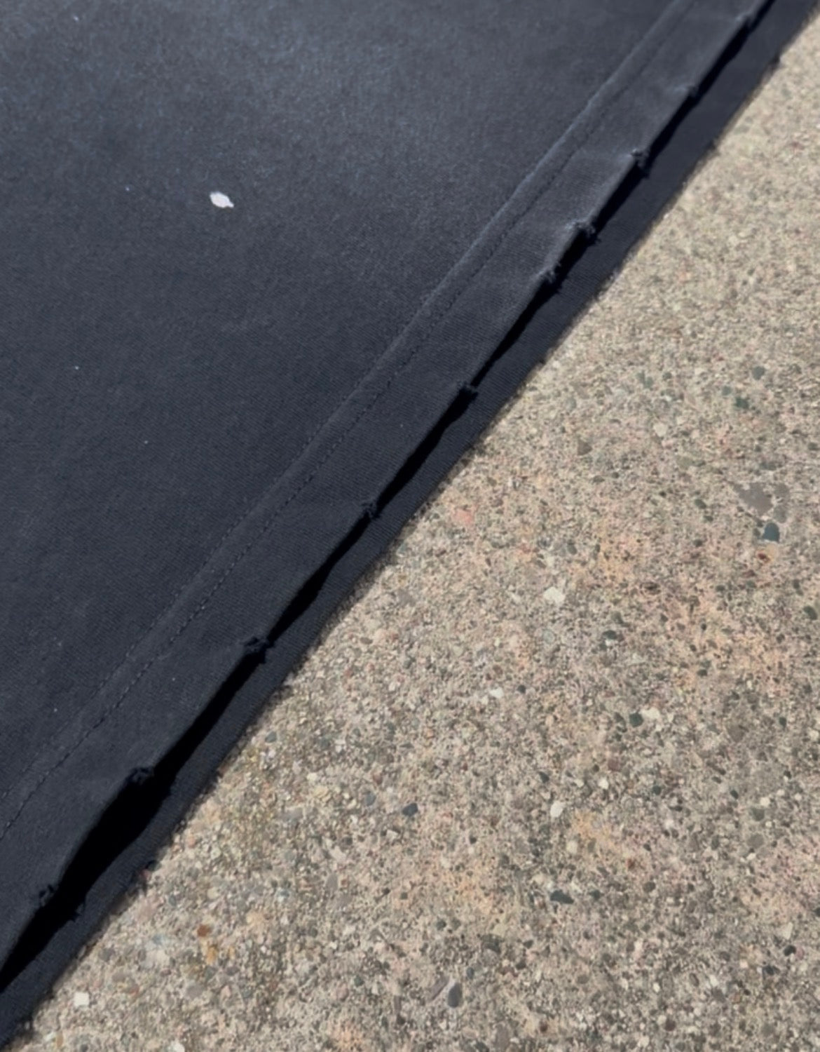 250gsm, sun fade washed with raw paint splatters + hand frayed edges. No two are the same.